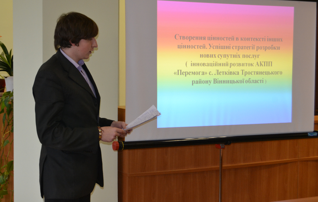 Зі вступним словом до учасників заходу звернувся перший проректор Мостов’як Іван ІвановичДиректор ТОВ «Cедна-Агро» Яровий Олег Станіславович відмітив гарну теоретичну підготовку студентів, їх креативність і сміливістьПрезентація наукової роботи (Чорній Євгенія, студентка 31-м групи факультету менеджменту)Презентація наукової роботи (Гайдамака Юлія, студентка 31-м групи факультету менеджменту)Презентація наукової роботи (Василик Інна, студентка 31-з групи факультету менеджменту)Презентація наукової роботи (Бабак Ніна, студентка 32-м групи факультету менеджменту)Презентація наукової роботи (Павло Богачик, студент 4 курсу факультету менеджменту)Презентація наукової роботи (Олександр Хрипун, студент 4 курсу факультету менеджменту)Нагородження: І місце - Чорній Євгенія (31-м група)Нагородження: ІІ місце - Гайдамака Юлія (31-м група)Нагородження: ІІІ місце - Василик Інна (31-з група)Нагородження: Хрипун Олександр (42-м група)Нагородження: Джугостранська АльонаНагородження: Марченко ВітаНагородження: Цикалюк ОлександрНагородження: Богачик Павло (42-м група)