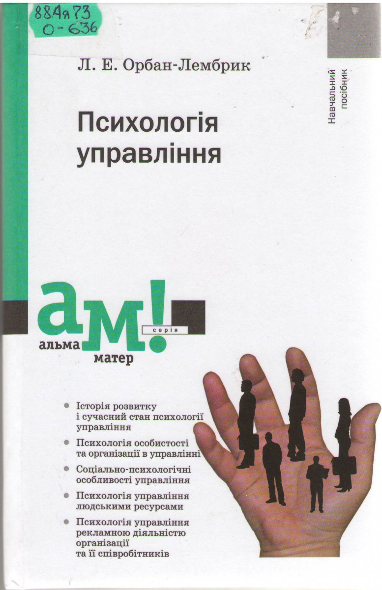 Орбан-Лембрик Л.Е. Психологія управління [Текст]: навч. посібник.- 2-ге вид., доп.- Київ: Академвидав, 2010.- 541,[2] с. Сутність сучасного управління полягає у спрямуванні ділового, творчого, лідерського потенціалу людей на досягнення спільних цілей. Однією із найважливіших передумов цього є психологічні знання про специфіку, закономірності індивідуальної і групової життєдіяль-ності, впливу на неї. Цією теоретичною і прикладною проблематикою займається психологія управління, що продукує знання про психологічні основи, соціально – психологічну, соціокультурну, етнопсихологічну специфіку, управлінської діяльності, чинники її ефективності, джерела керівництва і лідерства, причини конфліктів в управлінні, особливості і способи їх подолання, психологічні детермінанти діяльності керівників, стилів керівництва тощо. Означені питання висвітлені у навчальному посібнику, адресованому студентам ВНЗ. |