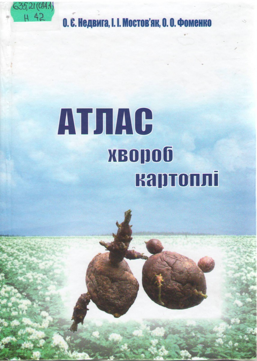 Недвига О.Є. Атлас хвороб картоплі [Текст]/ О.Є.Недвига, І.І. Мостов'як, О.О.Фоменко; за ред. О.Є. Недвиги.- Умань; Вінниця: Едельвейс і К, 2014.- 335,[1] с. У навчальному посібнику наведено біологічні особливості картоплі та ураженість її окремими хворобами, вимоги до умов вирощування і зберігання урожаю, розвиток, нагромадження та пристосованість патогенів. Стосовно кожної хвороби викладено практичні підходи до фітосанітарного моніторингу, визначається стратегія і тактика системи захисту рослин на основі екологічної концепції. |