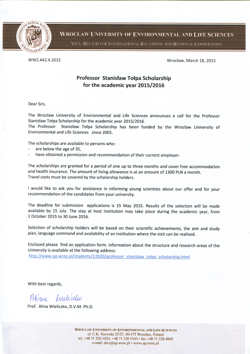 Вроцлавський Природничий Університет оголошує конкурс на здобуття стипендії професора Станіслава Толпи на 2015/2016 н.р.