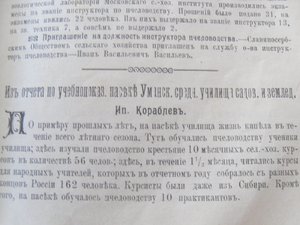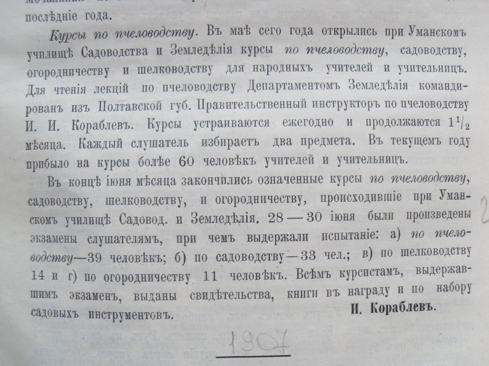 Наконецъ пасъка, служитъ также мъстомъ для практики народных учителей, являющихся ежегодно въ училище слушать курсы по разнымъ отрослямъ сельскаго хазяйства и, между прочимъ, по пчеловодству. Учителей желающихъ слушать курсы пчеловодства бывает 30 и болъе человекъ каждый годъ. Неръдко и совершено постороннія училищу лица являются на пасъку получить тотъ или другой практическій совътъ; постороннихъ посътителей на пасъкъ, являющихся за разными совътами по пчеловодству, въ теченіи лета насчитывается до 200 и более».