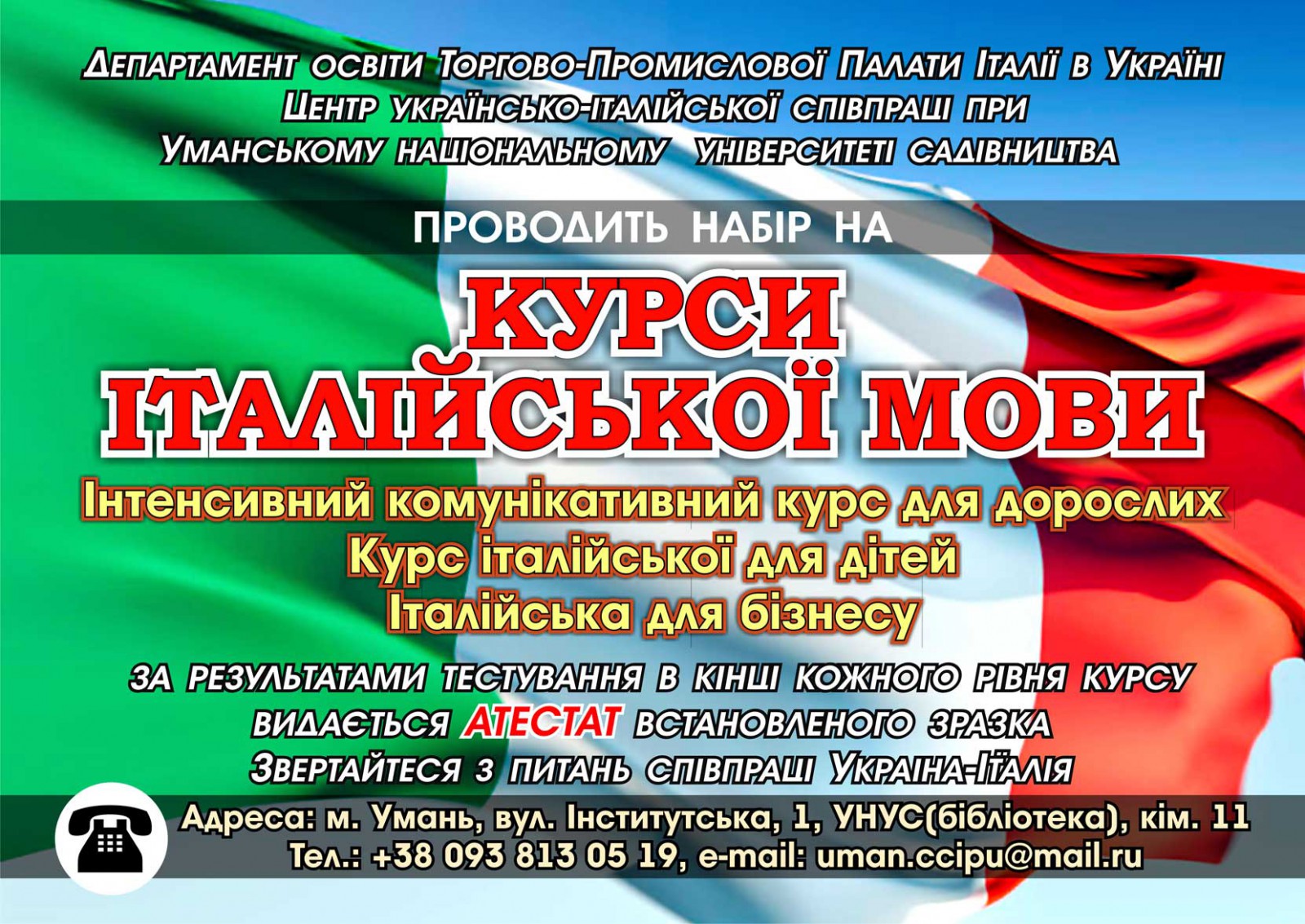 Департамент освіти Торгово-Промислової Палати Італії в Україні та Центр українсько-італійської співпраці при Уманському національному університеті садівництва проводить набір на курси італійської мови.