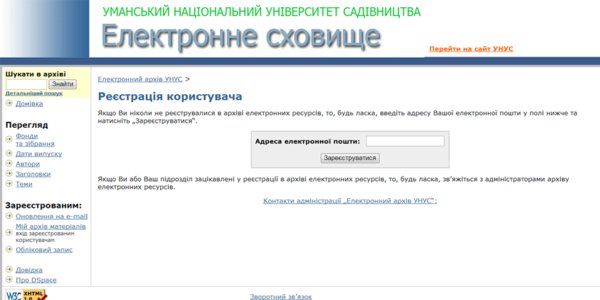 В Уманському національному університеті садівництва розгорнуто інституційний електронній архів (репозитарій). Мета його створення – постійний, швидкий, повнотекстовий доступ до наукових та навчальних матеріалів з глобальної мережі Internet в режимі реального часу.