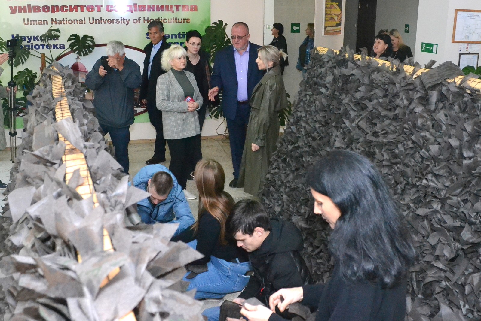 — Повномасштабне вторгнення тільки посилило волонтерський рух в університету. Раніше ми приймали внутрішніх переселенців. А сьогодні кожен захід в університеті є благодійним і ми збираємо кошти для волонтерської організації «4.5.0 Україна». Також на території університету на трьох локаціях плетуть маскувальні сітки, — розповіла Світлана ВЛАСЮК, яка запросила гостей подивитись, які сітки виплітають університяни.