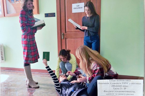 Номінація «Шалений день» має безліч шедеврів та виокремили фото студентки Тамари КОРНІЄНКО група 21–зр., факультет плодоовочівництва, екології та захисту рослин, адже світлина зображає студентку, що лежить на підлозі зомліла, не випускаючи з рук заліковку. Поруч стоять викладачі, а студенти намагаються надати домедичну допомогу та привести дівчину до свідомості;