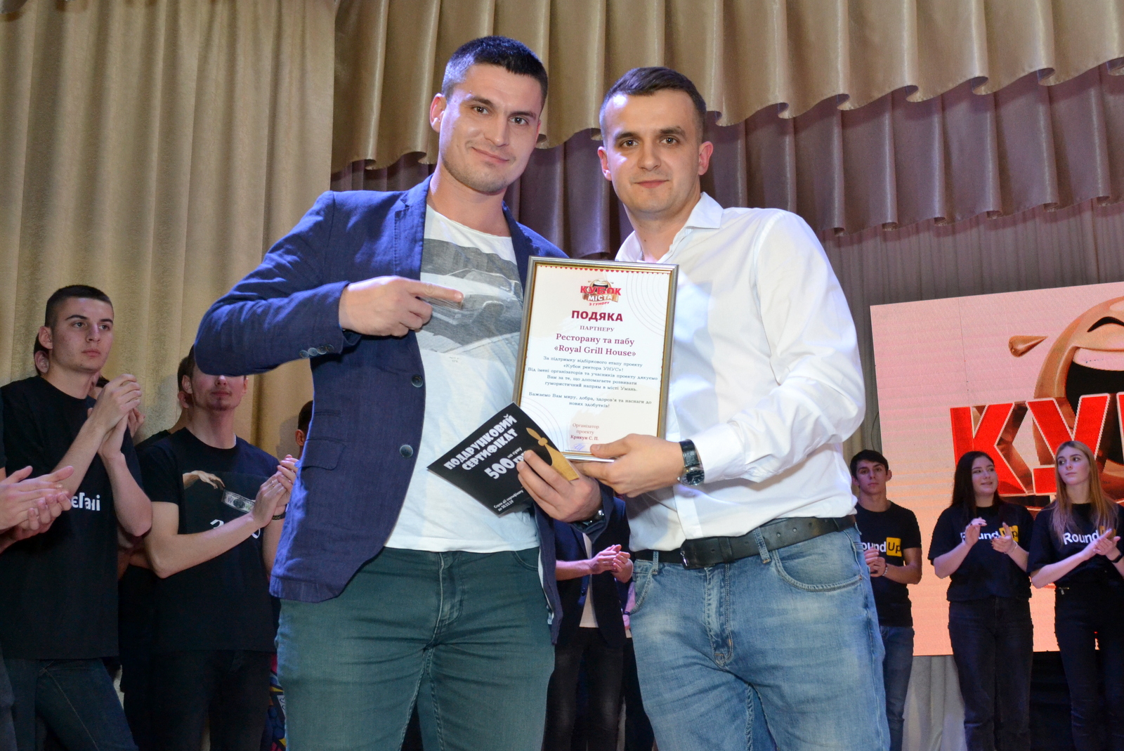 Актова зала, вщент наповнена вболівальниками й охочими посміятися, сяяла від приємної атмосфери і гарних людей, адже основу складали студентська молодь, організатори свята, викладачі та партнери з підготовки й організації свята. Генеральний партнер – Житловий квартал Греків Ліс; Преміум партнер – Благодіний фонд «Разом з Кернел»; Партнери – Рекламна агенція Карін; мережа магазинів Школяр; компанія ТІМ; карооке-бар «Контрабас» та ресторан «Подорож», ресторан-паб «Роял гріл Хауз»; компанія «Будкомфорт»; «Кавун»; мережа ресторанів швидкого харчування «Крила»; кінотеатр «Прем’єра».
