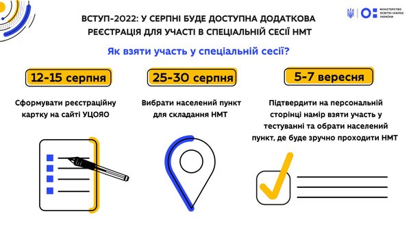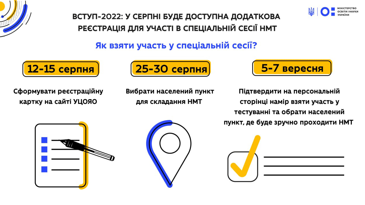 з 12 до 15 серпня 2022 року сформувати реєстраційну картку на сайті УЦОЯО; з 25 до 30 серпня вибрати населений пункт для складання НМТ на персональній сторінці; з 5 до 7 вересня підтвердити на персональній сторінці намір взяти участь у тестуванні та вибрати населений пункт, що найбільш наближений до місця перебування в період проведення спеціальної сесії.