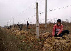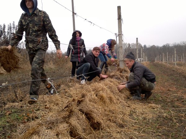 Запорукою успішної перезимівлі винограду в зоні ризикованого ведення цієї культури є вкривання кущів до настання стійких морозів. Під керівництвом завідувача відділення плодівництва ННВВ Галини Гавінської свою вправність з укривання кущів соломою продемонстрували студенти старших курсів – 42-п і 61-пм груп.