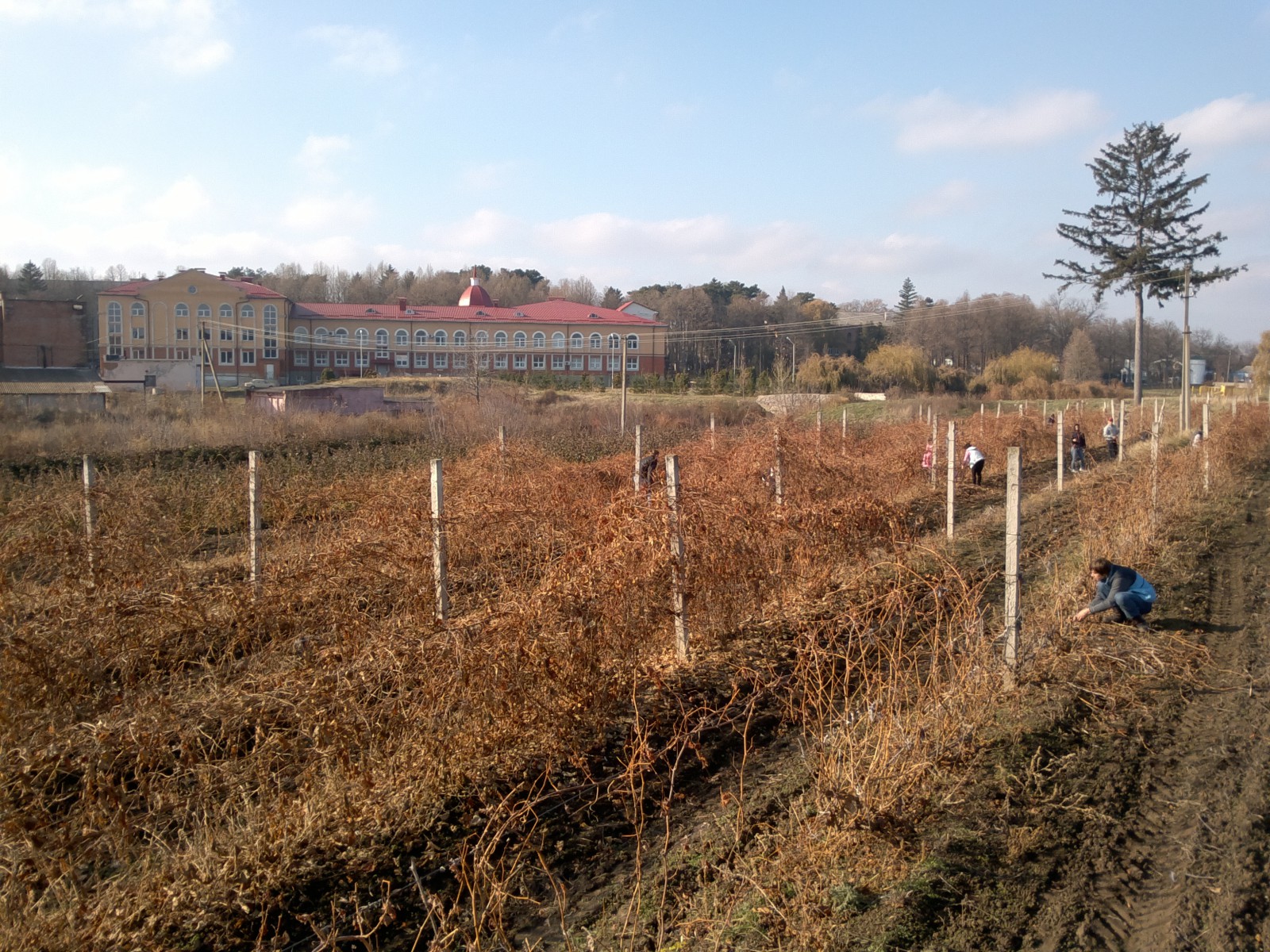 Перший етап підготовки до вкривання кущів на зиму полягав у попередньому їх обрізуванні. Виконуючи цей важливий для укривної зони виноградарства захід студенти 31-п і 32-п вдало поєднати здобуті під час теоретичного вивчення дисципліни знання з творчим індивідуальним підходом. Адже далеко не завжди в кінці періоду вегетації на винограднику можна віднайти ідеальні форми кущів на кшталт таких як на плакатах, у посібниках і підручниках.