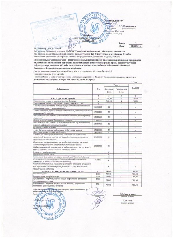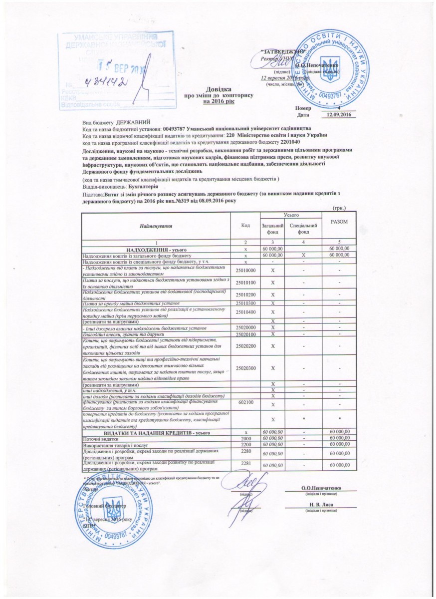 Зміни до кошторису на 2016 рік (наукова діяльність)